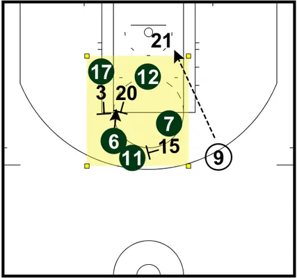 A peine Boykins a-t-il contourné son coéquipier qu'il est victime d'un écran de Bonner en tête de raquette. Bogut est toujours coincé par les 2 écrans. A ce moment là, 8 joueurs sont positionnés en tête de raquette (zone colorée sur l'image ci-dessous), et c'est la confusion la plus totale.