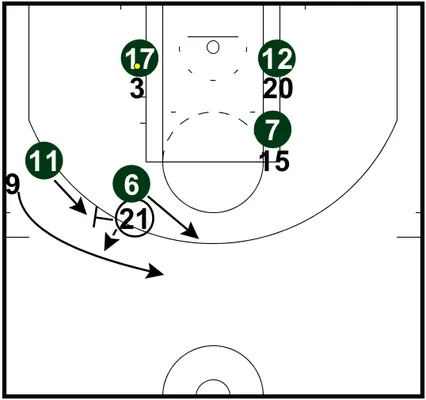 Immédiatement après avoir posé son écran, Tim Duncan coupe vers le panier. Boykins est toujours à la poursuite de Parker. Mais il est gêné par Bogut, qui voudrait retrouver son joueur. En parallèle, George Hill et Manu Ginobili viennent tout deux poser un écran en tête de raquette (zone colorée sur l'image ci-dessous), pour empêcher l'intérieur de revenir.