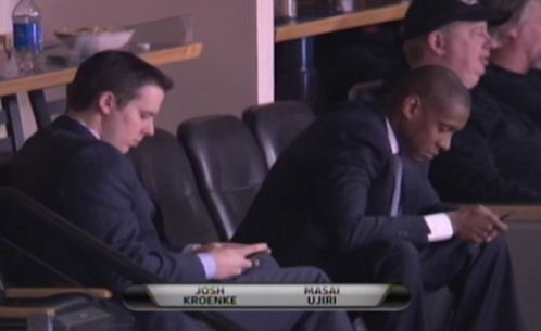 Comme le prouve l’image ci-dessous, les dirigeants des Nuggets n’ont pas forcément regardé le match entre Denver et Miami. Collés à leur Blackberry, Josh Kroenke, le président et Masai Ujiri, le GM, ont passé leur soirée à étudier des offres. Ils ne l’ont pas caché d’ailleurs.