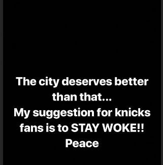 Il a suffi de quelques mots postés dans une « story » Instagram pour en avoir un aperçu plutôt éloquent. « Cette ville mérite mieux que ça… Ma suggestion pour les fans des Knicks, c’est SOYEZ VIGILANTS ! » Difficile d’y voir autre chose qu’un tacle sans équivoque envers la direction… puisque le slogan “stay woke” est contestataire et sous-entend une résistance.