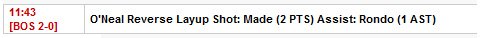 Comme on le voit sur cette capture d’écran de la boxscore, Rajon Rondo a réalisé la première passe décisive du match. Une passe pour Shaquille O’Neal qui n’est que la première de ses 13 assists du jour.