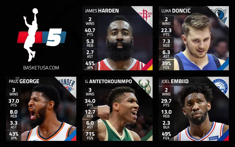 Encore une fois, James Harden s'impose dans notre cinq majeur de la semaine et, encore une fois, il y avait du monde pour l'accompagner sur le backcourt. Entre les “triple double” de Russell Westbrook, l'efficacité du duo Stephen Curry – Klay Thompson ou les 69% de réussite à 3-points de JJ Redick. Au final, on a hésité entre Bradley Beal et Luka Doncic, et si le premier était plus adroit, la maîtrise du Slovène avec un groupe pourtant limité a fait la différence.