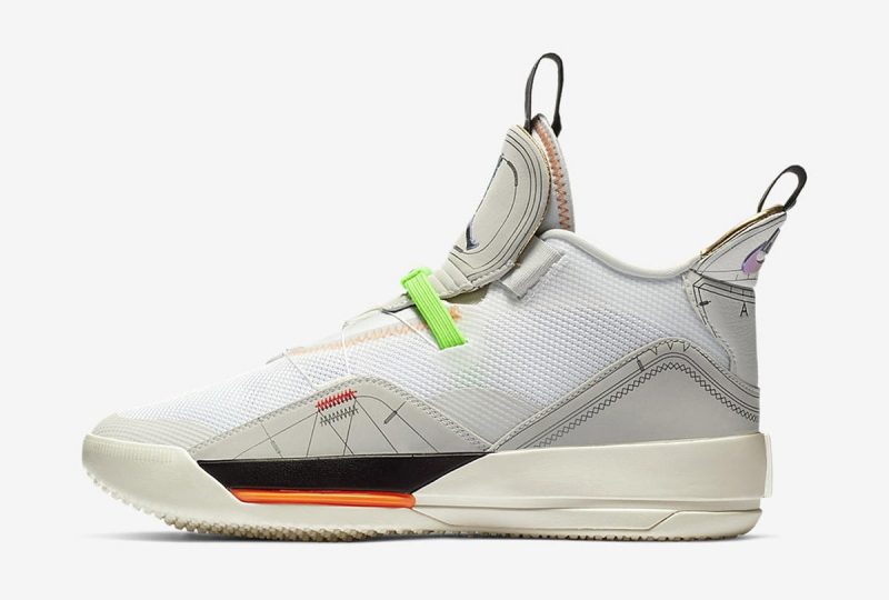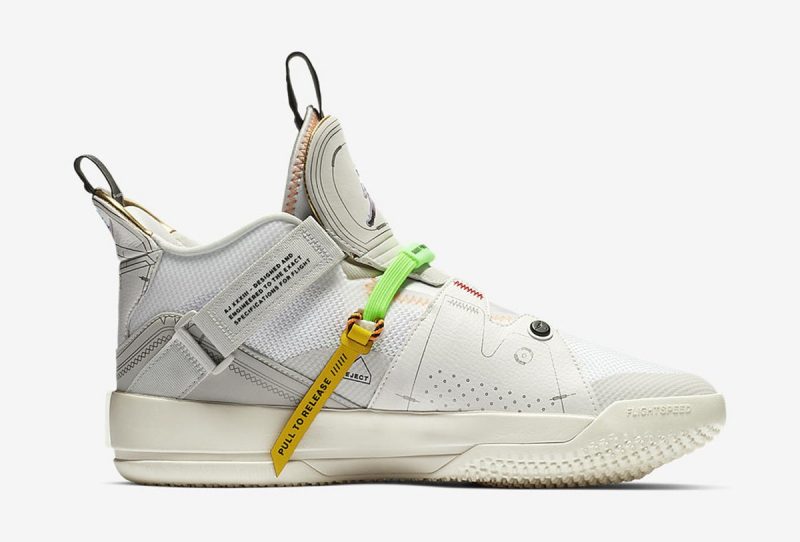 La Air Jordan 33 continue de se décliner et, cette fois, dans un coloris assez surprenant, nommé “Vast Grey” : outre la tige blanc cassé, le système de serrage est désormais vert fluo tandis que celui de desserrage est renforcé par une nouvelle corde, absente sur les premiers modèles, avec l’indication : “Pull to release”. Enfin, les logos prennent une teinte holographique.