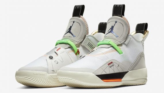 La Air Jordan 33 continue de se décliner et, cette fois, dans un coloris assez surprenant, nommé “Vast Grey” : outre la tige blanc cassé, le système de serrage est désormais vert fluo tandis que celui de desserrage est renforcé par une nouvelle corde, absente sur les premiers modèles, avec l’indication : “Pull to release”. Enfin, les logos prennent une teinte holographique.