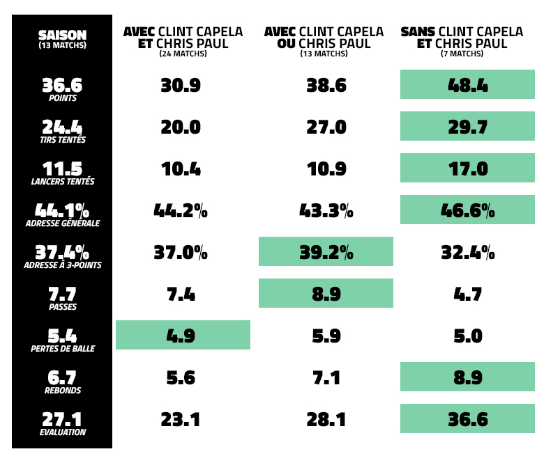 Le “Big Three” texan (James Harden, Chris Paul et Clint Capela) n’a ainsi pu jouer que 23 matchs ensemble depuis le début de saison (pour 14 victoires) entre les allers-retours du meneur à l’infirmerie et la blessure au pouce du pivot suisse.