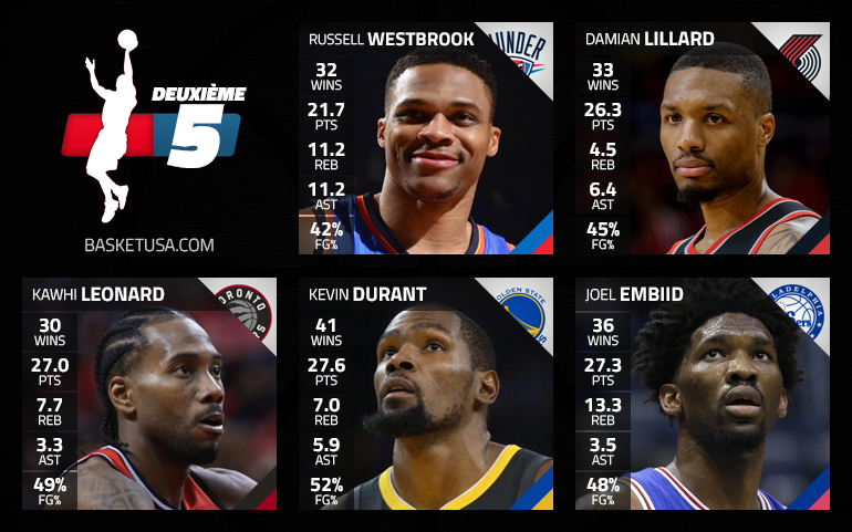 Le premier cinq se détache assez nettement, avec Giannis Antetokounmpo qui décroche le plus de points, devant (et dans cet ordre) James Harden, Stephen Curry, Paul George et Nikola Jokic. Un beau quintette pour la course au MVP. Derrière, on retrouve (là aussi dans cet ordre) Joel Embiid, Kevin Durant, Russell Westbrook, Kawhi Leonard et Damian Lillard.