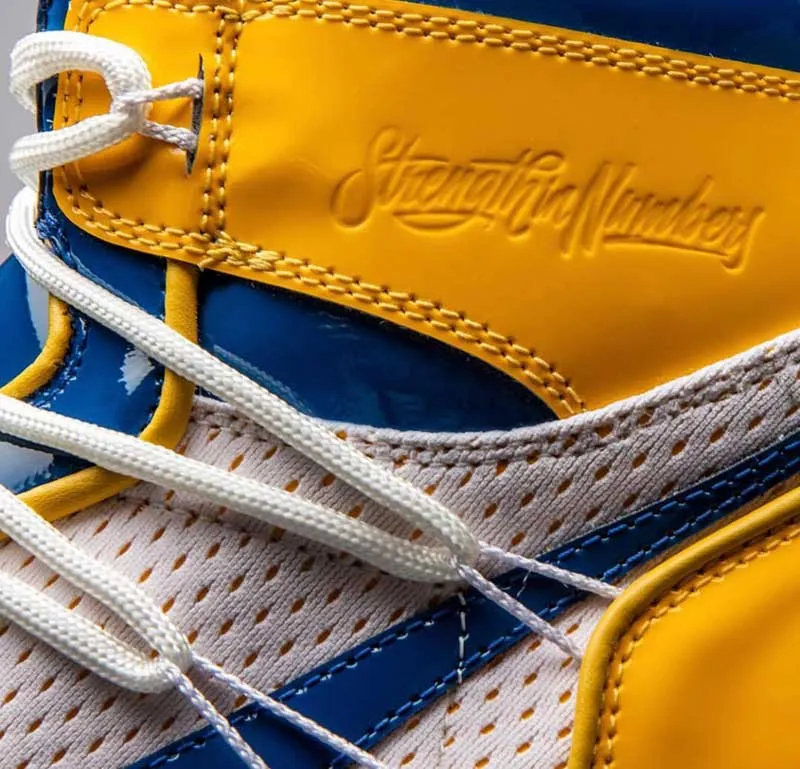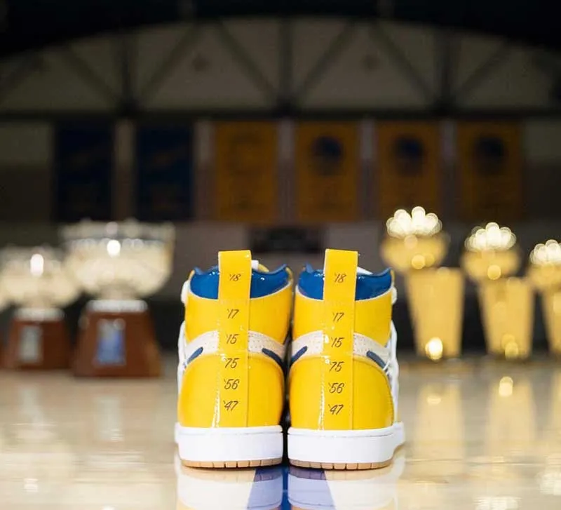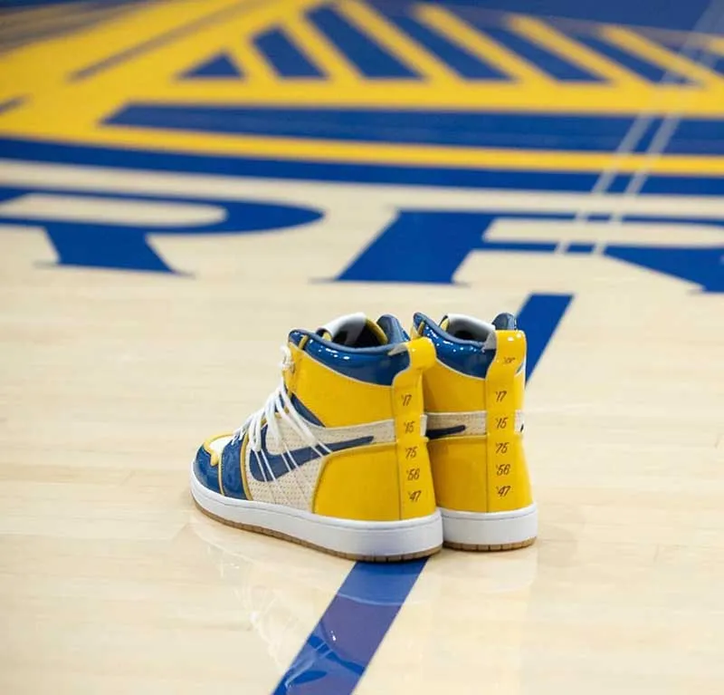 Sur l'empeigne, on retrouve des morceaux d'un maillot utilisé en match. Le système de laçage utilise des filets du terrain d'entraînement de la franchise. Le logo Wings de la première Jordan a été remplacé par la devise “Strength in Numbers.” Au talon, les dates des titres des Warriors sont gravées au laser. Un logo doré orne la languette.