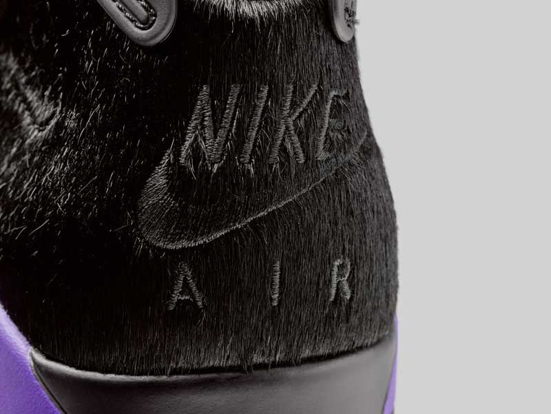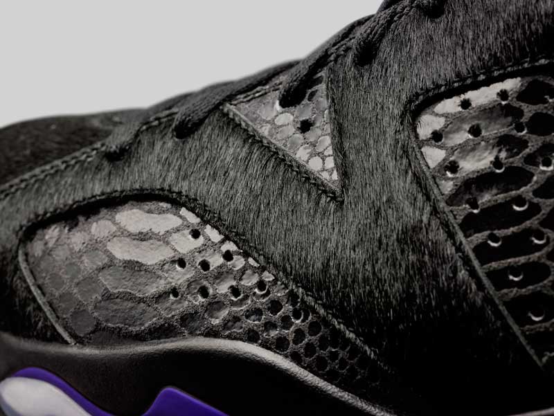 La paire, aussi, est unique. Sur la tige, le crin de poney rencontre le simili reptile. Les touches de violet ne sont pas un hasard. Car le coloris est une collaboration avec Social Status, une boutique de Charlotte, qui glisse donc cette petite référence aux Hornets. Le tout est posé sur une semelle translucide.