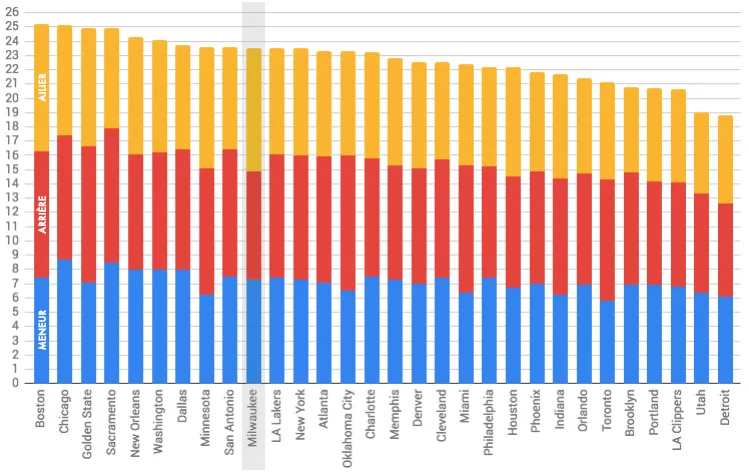 Car toute la stratégie des Bucks repose donc sur cette double logique : protéger au maximum le cercle, et ne pas se préoccuper des shooteurs extérieurs faibles ou moyens. Action Network a ainsi représenté le nombre de 3-points accordés à l’adversaire par position. Or, si on ne tient compte que des meneurs, arrières et ailiers, la défense extérieure de Milwaukee est assez standard en autorisant 23.2 tirs derrière la ligne à 7m25.