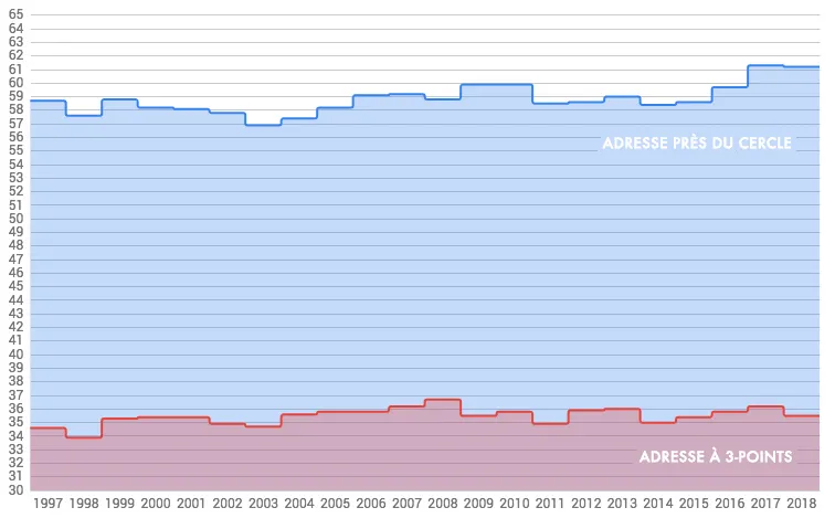 Alors que l’adresse extérieure est assez stable aux alentours de 35.5% de réussite depuis vingt ans, l’adresse près du cercle est par contre passée de 58% à plus de 61% de réussite en trois ou quatre ans. Cette hausse, conjuguée à la baisse de l’utilisation du tir à mi-distance (et en comptant les lancers francs), fait que, désormais, la réussite moyenne des joueurs à 2-points est équivalente à une réussite de 37% de loin, et non plus 33%, comme c’était depuis longtemps défini.