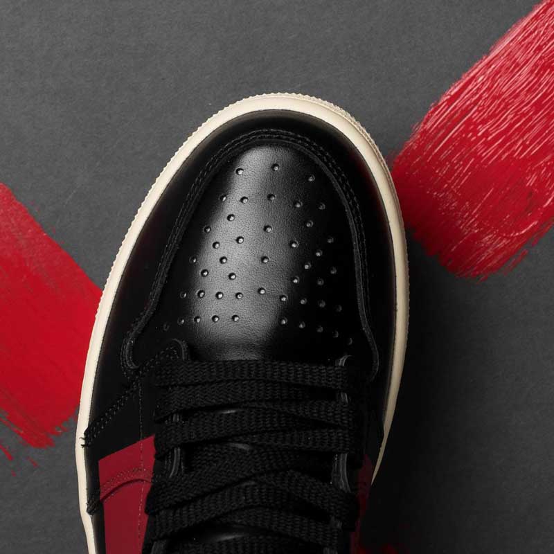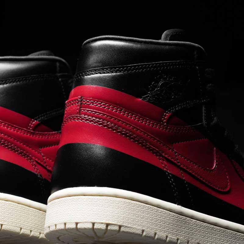 Avec une finition en cuir très soignée, la paire fait belle impression. Mais pour ne pas oublier les parquets, une bande rouge traverse l’empeigne. Une manière de rappeler avec style le ban imposé à la chaussure par la NBA, tout en faisait un clin d’oeil aux couleurs des Bulls.