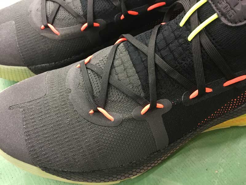 À la sortie de la boite, la Curry 6 est une chaussure rigide. Difficile de la plier à la main. Sur l’empeigne, Under Armour reste fidèle à son textile très fin. Vous risquez donc de sentir un peu les lacets. Raide en bas, lacets en haut… Les premières minutes ne sont pas forcément évidentes. De plus, le serrage n’est pas aidé par le fait que les lacets glissent un peu et ont du mal à rester en place dans les boucles quand vous les tirez en remontant petit à petit.