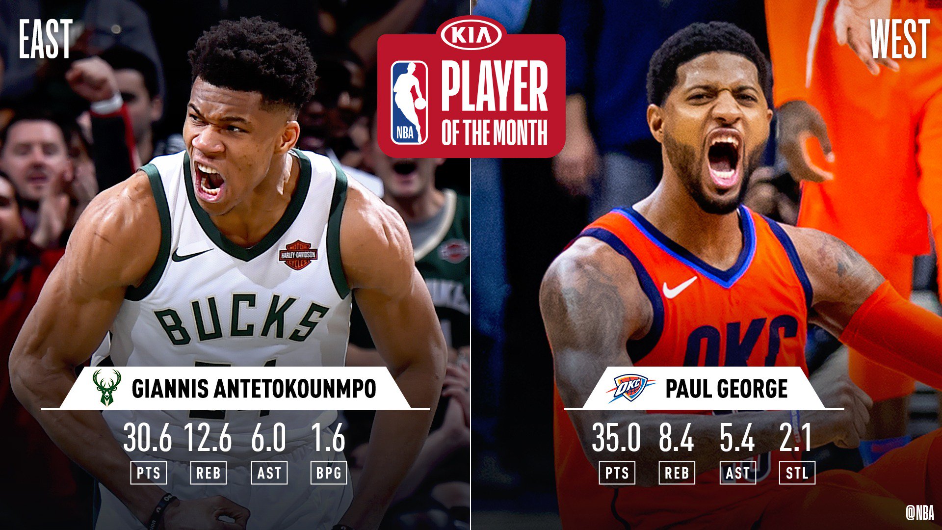 À l’Ouest, c’est Paul George et ses 35 points, 8.4 rebonds et 5.4 passes, pour 6 victoires en 10 matchs, qui a été choisi, la ligue ayant finalement préféré l’ailier du Thunder à James Harden.