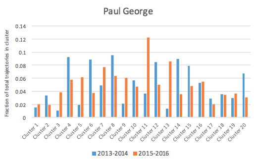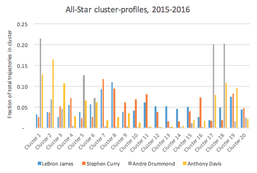 On voit ainsi qu’Andre Drummond fait ainsi préférentiellement des mouvements de type 1, 17 et 18, qui sont des trajectoires vers le cercle ou le poste bas, tandis que Stephen Curry est plutôt dans la catégorie 7, 8 et 11, qui sont des mouvements vers la ligne des lancers après un écran (soit du pick-and-roll) ou vers le cercle.