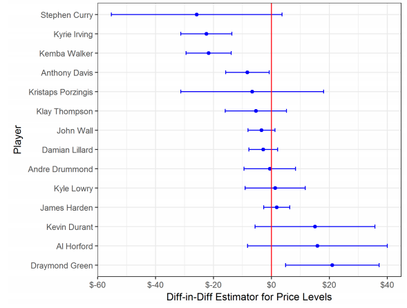 On voit que c’est l’absence de Stephen Curry qui a le plus d’impact sur le prix des places, puisqu’on peut les avoir 25 dollars moins chères qu’à l’accoutumée quand le double MVP n’est pas là. Kyrie Irving et Kemba Walker suivent.