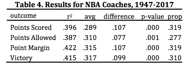 La conclusion ? En NBA, entre 1947 et 2017, le coach compte pour 31.9% au niveau des points marqués, pour 27.7% au niveau des points encaissés et pour 31% au niveau du nombre de victoires sur la saison. En gros, les résultats d’une équipe en saison régulière dépendraient à un tiers des choix du coach en termes de styles offensif et défensif.