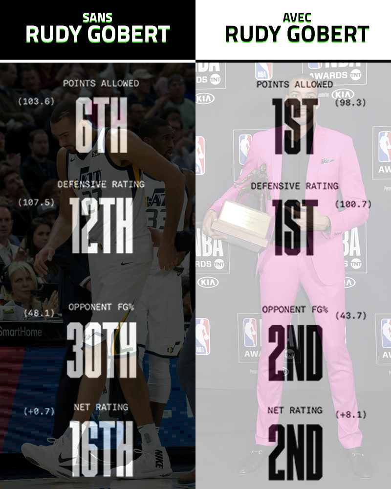 C’est le retour de blessure Rudy Gobert qui a fait la différence, mettant en lumière l’explosion de Donovan Mitchell, avec un duo de vétérans Rubio/Ingles à son meilleur à leurs côtés. Utah allait alors enchaîner avec un 21-6, avant d’éliminer le Thunder au premier tour des playoffs. Et le Français, dont la qualité de facteur X ne pouvait plus être ignorée, allait logiquement recevoir le trophée de DPOY.