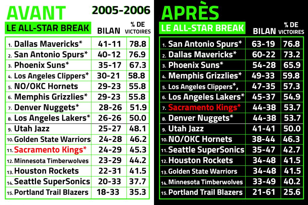 De quoi prendre la place des Lakers notamment dans le Top 8, qui avaient perdu dans le même temps 19 de leurs 21 derniers matchs, ratant les playoffs pour la première fois depuis onze ans. Les débuts compliqués de l’ère post-Shaq.