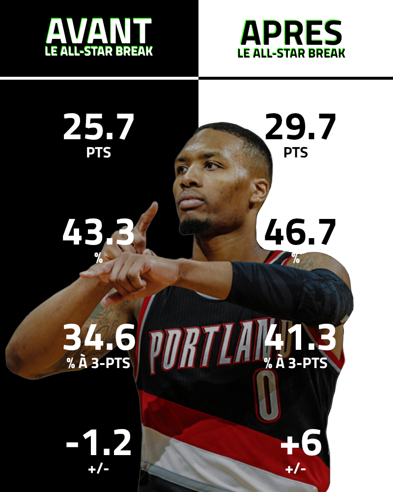 Débarrassé d’une gêne à la cheville et sans doute motivé par sa non-sélection au All-Star Game, le meneur de jeu va faire basculer la saison des Blazers avec 28 victoires en 36 matchs, jusqu’à les qualifier pour les playoffs avec une sortie à 59 points. “Dame Time”.