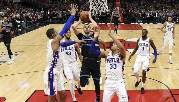 98-88. Moins de six minutes à jouer. Les Sixers ont enfin réussi à faire le break, et on voit mal comment les Bulls vont réagir. D'autant que le tempo est lent, et que Philly a bien la main sur le match. C'est le moment choisi par Zach LaVine pour prendre feu. Certes, Ben Simmons et TJ McConnell ne défendent pas dur, mais l'arrière des Bulls agresse la défense et ça marche. Avec style, comme sur ce 3-points dans le corner pour ponctuer un 7-0 en une minute.