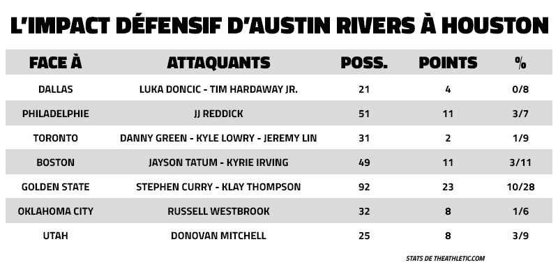 « On voit beaucoup P.J. (Tucker) et Clint (Capela) en défense mais sa défense sur le porteur de balle est impressionnante », qualifie Gary Clark. Davantage mobilisé en attaque à son arrivée à Houston, Austin Rivers a vu son volume de tirs diminuer avec le retour des blessures de Chris Paul et des autres absents. Un rôle plus actif en défense n’a pas l’air de lui déplaire.