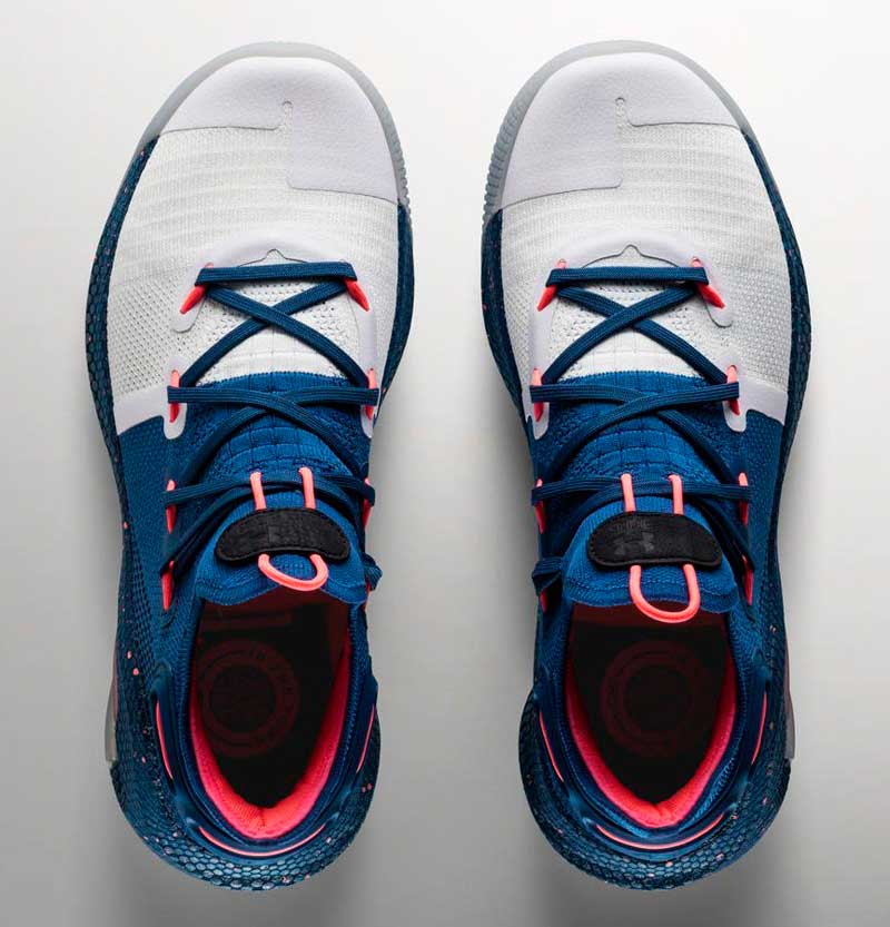 Voilà pourquoi des confettis tombent sur la semelle, sous un bleu qui rappelle les Warriors. Under Armour ne précise pas s’il s’agit de célébrer les titres précédents ou bien d’annoncer le suivant.