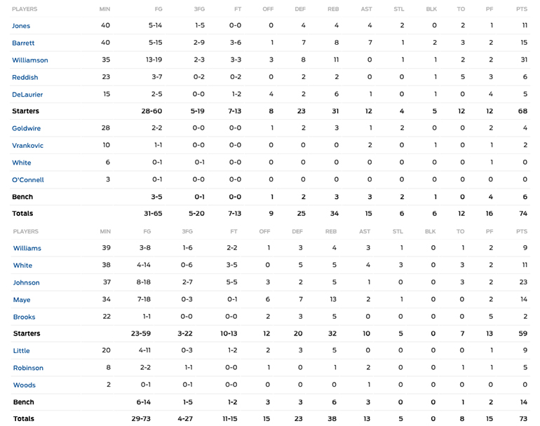Car c’est bien UNC qui démarre le mieux le match, avec un Cameron Johnson bouillant et un Luke Maye toujours bien placé. L’écart atteint même les +13 (33-20) pour North Carolina, mais le duo Williamson – Barrett limite la casse de loin, tandis qu’un nouveau 3-points de Zion Williamson permet à Duke de rejoindre les vestiaires à égalité (44-44) à la pause.