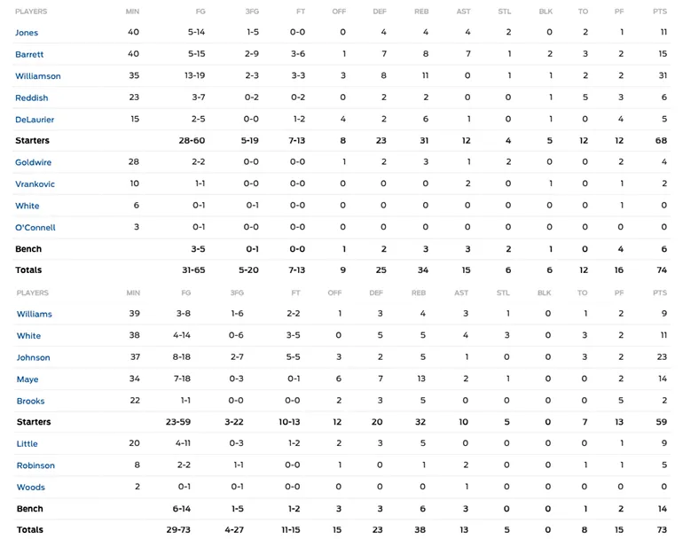 Car c'est bien UNC qui démarre le mieux le match, avec un Cameron Johnson bouillant et un Luke Maye toujours bien placé. L'écart atteint même les +13 (33-20) pour North Carolina, mais le duo Williamson – Barrett limite la casse de loin, tandis qu'un nouveau 3-points de Zion Williamson permet à Duke de rejoindre les vestiaires à égalité (44-44) à la pause.