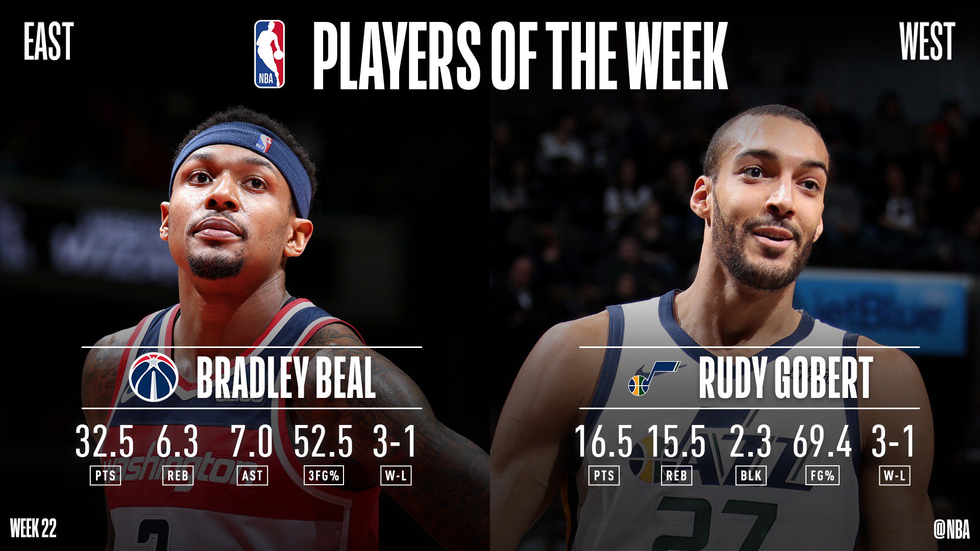 À l’Est, pas de surprise avec Bradley Beal, déjà récompensé trois fois en carrière. L’arrière des Wizards a rejoint Gilbert Arenas et Michael Jordan dans l’histoire de sa franchise avec deux matchs de suite à 40 points et plus. Ses stats sur la période : 32.5 points, 7 passes et 6.3 rebonds de moyenne. Le tout avec un superbe 53% à 3-points.