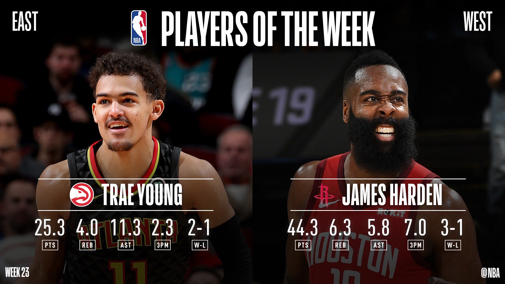 44.3 points, 6.3 rebonds et 5.8 passes de moyenne, à 53% de réussite de loin. Avec de telles stats, et trois victoires en quatre matchs, James Harden n’était pas un joueur de la semaine très difficile à trouver pour la conférence Ouest.