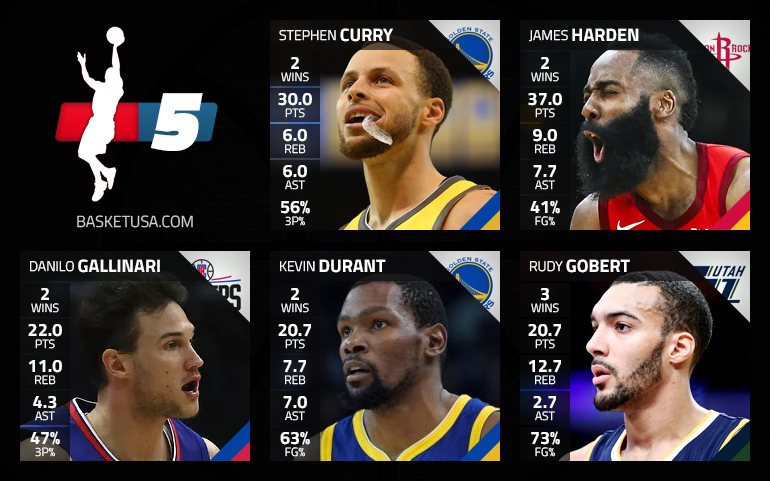Pas simple de dégager un cinq majeur cette semaine, tant la fin de saison voit des mises au repos qui modifient les résultats et l’appréciation des matchs. S’il est encore une fois compliqué de passer à côté de James Harden, on aurait pu retrouver Trae Young, Donovan Mitchell, Buddy Hield, Damian Lillard, Bradley Beal ou Dion Waiters à ses côtés. On opte quand même pour Stephen Curry, bouillant à 3-points sur la semaine, même si la défaite face aux Wolves atténue l’impression d’ensemble.