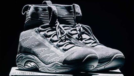 La paire a l’air de mélanger les époques, avec le tissu moderne sur l’extérieur, alors que l’intérieur du pied semble toujours s’habiller de daim.