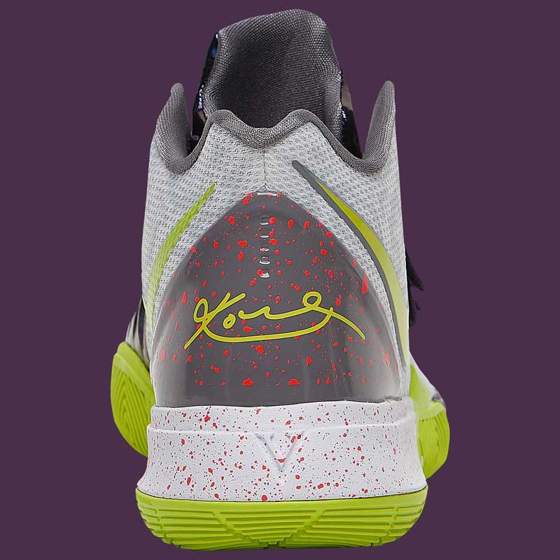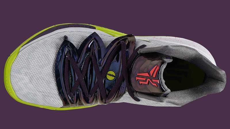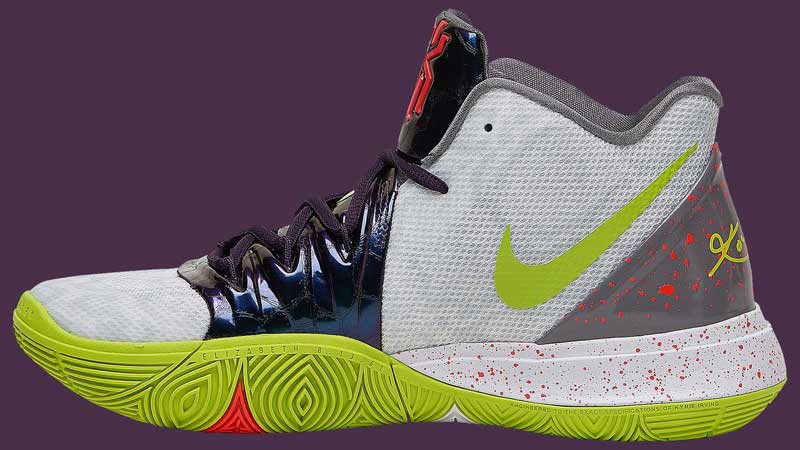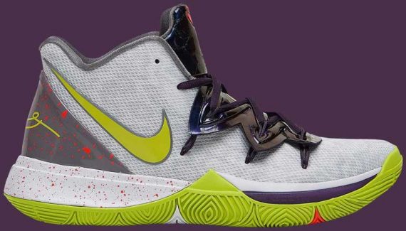 La Kyrie 5 va s’inspirer du coloris “Chaos” de la Kobe V sortie en 2009. Les amateurs de sobriété passeront donc leur chemin devant le mélange de violet, de vert pomme ou de taches rouges.