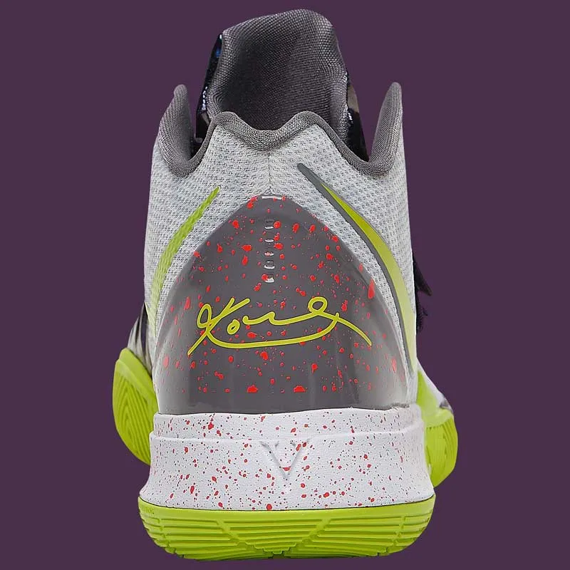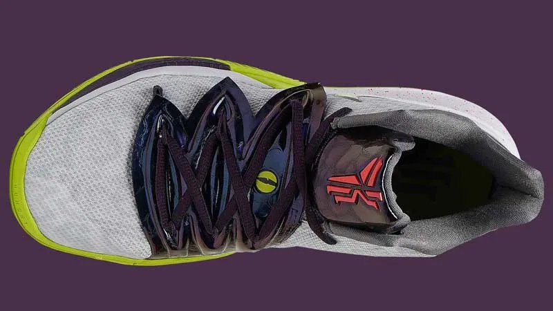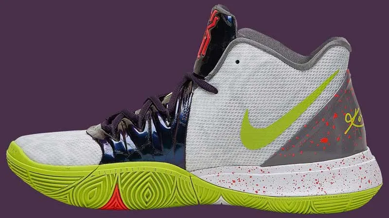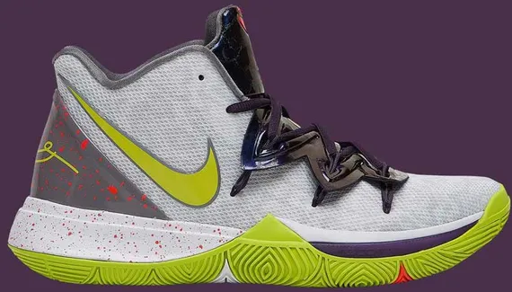 La Kyrie 5 va s'inspirer du coloris “Chaos” de la Kobe V sortie en 2009. Les amateurs de sobriété passeront donc leur chemin devant le mélange de violet, de vert pomme ou de taches rouges.