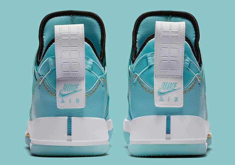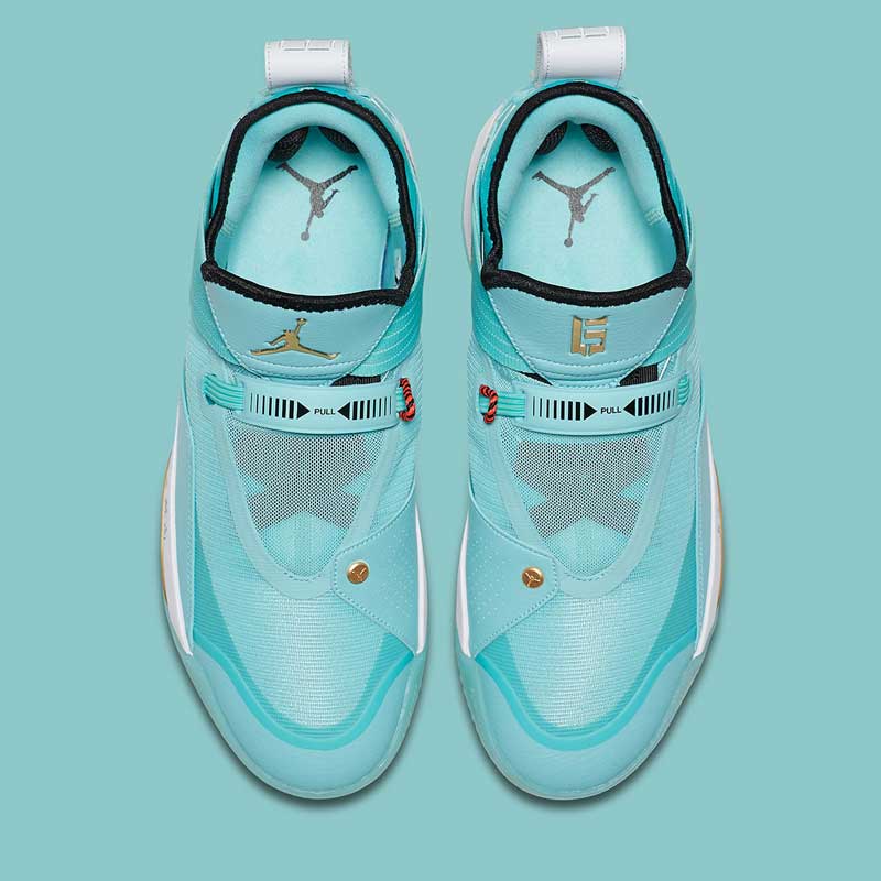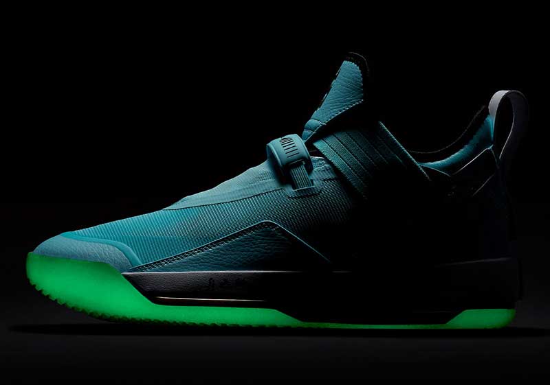 Un coloris plutôt réussi, avec une dominante bleu ciel, mais aussi quelques détails dorés, noir ou or. Si la lumière s’éteint, la semelle est phosphorescente. Sur le plan technique, on garde le laçage rapide et la sangle de la Air Jordan 33 classique.