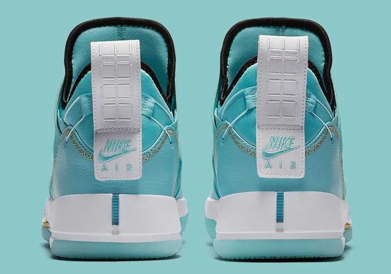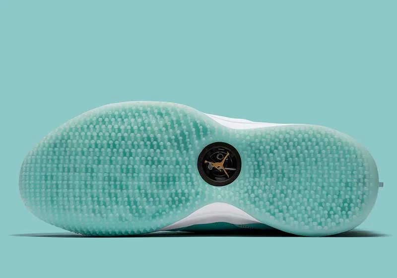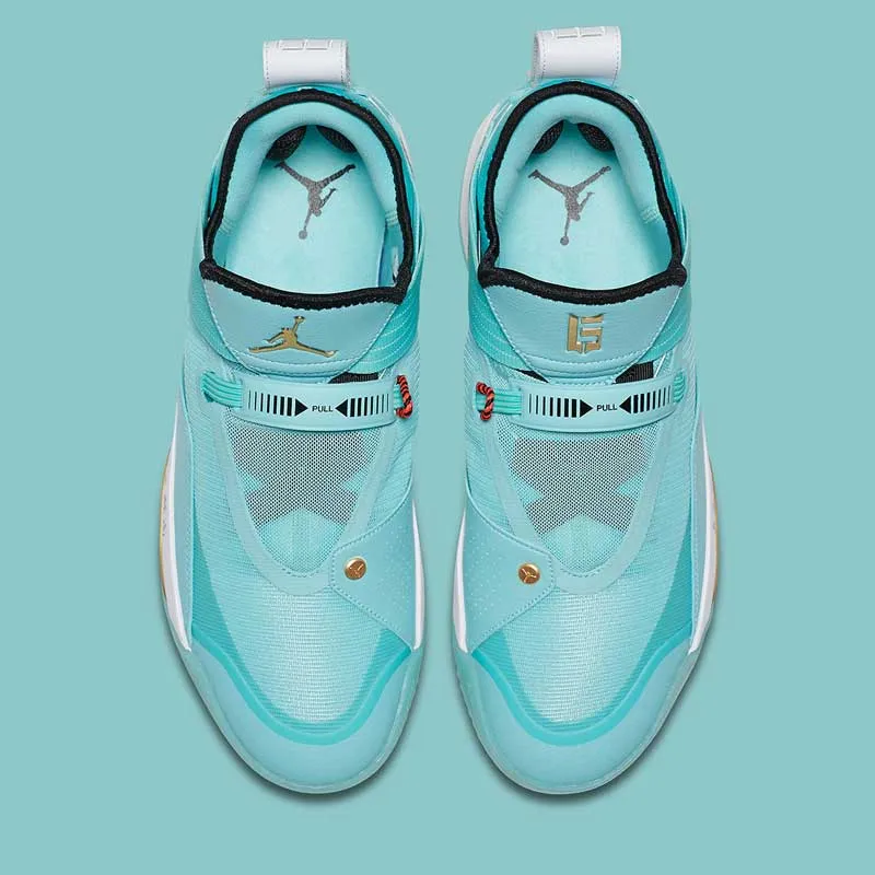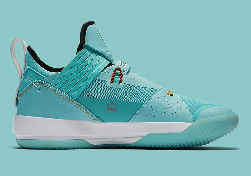 Un coloris plutôt réussi, avec une dominante bleu ciel, mais aussi quelques détails dorés, noir ou or. Si la lumière s'éteint, la semelle est phosphorescente. Sur le plan technique, on garde le laçage rapide et la sangle de la Air Jordan 33 classique.
