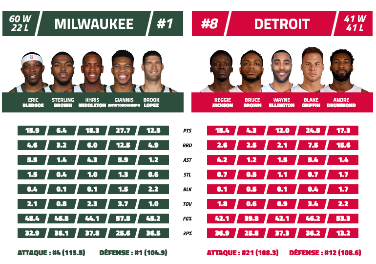 En face, Blake Griffin est le vrai créateur des Pistons. Tout passe par lui en attaque alors qu’Andre Drummond reste un pivot à l’ancienne qui domine dans la raquette, mais n’apporte pas de danger au large. Sur la fin de saison, c’était presque l’arme numéro 1 de Detroit, mais les doutes sur le genou de Blake Griffin ne laissent rien augurer de bon, surtout qu’il va devoir se coltiner Giannis Antetokounmpo et qu’il n’y a personne d’autre pour le suppléer à ce niveau…