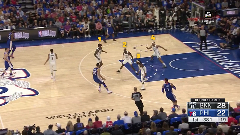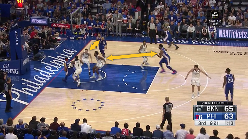 Bien sûr, il y a quand même un shooteur à Philadelphie mais Daniel Kawashima montre bien comment les Nets “top-lock” JJ Redick, c’est-à-dire qu’ils se placent entre lui et le ballon, afin de l’empêcher de remonter pour prendre les écrans qu’il a l’habitude d’utiliser afin de se créer des positions ouvertes. C’est une stratégie défensive assez risquée, mais comme Brooklyn a décidé de faire l’impasse sur un paquet de joueurs, ils peuvent tout à fait vivre avec les problèmes que ça pose.