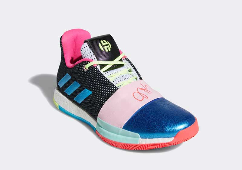 Tout est dépareillé entre les deux pieds. La mousse Boost blanche est le seul point commun. Cette Harden Vol.3 devrait être disponible dans les semaines à venir.