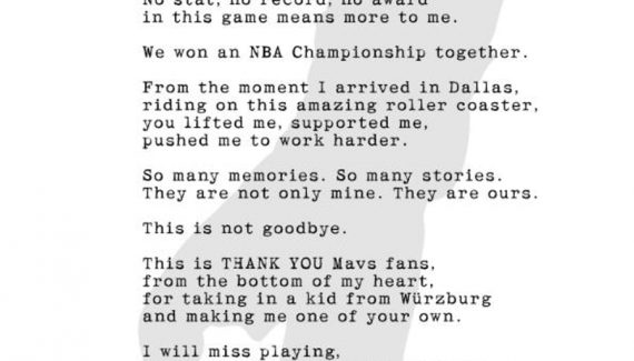 C’est devenu une tradition en NBA quand un joueur quitte un club après plusieurs saisons dans une ville : s’offrir une page dans le journal local pour remercier les fans locaux. Dirk Nowitzki aurait pu acheter tout le Dallas Morning News, mais il s’est lui aussi contenté d’une page, tout en sobriété.