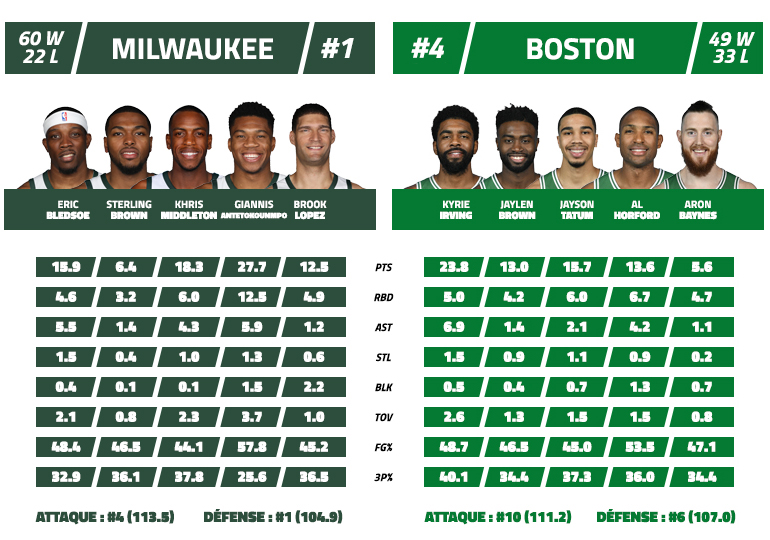 Jayson Tatum s’est imposé cette année comme le premier lieutenant de Kyrie Irving et a respecté ce statut au premier tour (19.3 points de moyenne) tandis que Jaylen Brown a parfaitement remplacé Marcus Smart dans le cinq de Brad Stevens (11 points et une grosse présence défensive sur Bojan Bogdanovic), une très bonne nouvelle pour la franchise. Les deux joueurs et leur camarade Terry Rozier s’étaient révélés il y a un an face aux Bucks, ils arrivent en jambes pour cette revanche.