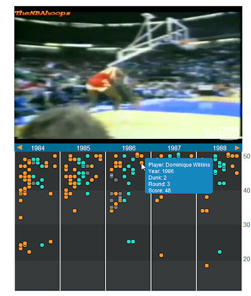 Jason and Matt Bailey sont deux frères, dingues de basket, de base de données et d’informatique. Ils s’occupent du site Hoopism et viennent de mettre au point ce qu’ils appellent le ” Slam Dunk Contest Video Visualization”, un outil permettant de voir ou revoir la quasi totalité des dunks des Slam Dunk Contest depuis 1984.