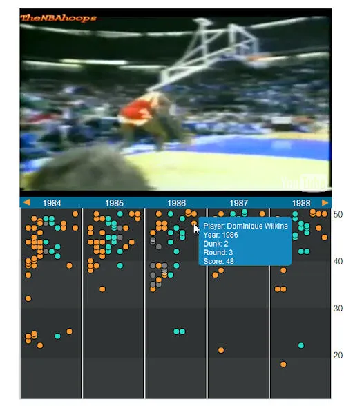 Jason and Matt Bailey sont deux frères, dingues de basket, de base de données et d'informatique. Ils s'occupent du site Hoopism et viennent de mettre au point ce qu'ils appellent le ” Slam Dunk Contest Video Visualization”, un outil permettant de voir ou revoir la quasi totalité des dunks des Slam Dunk Contest depuis 1984.