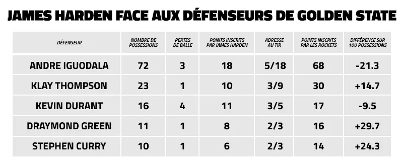 Dans les chiffres, cela donne qu'Andre Iguodala s'est occupé de James Harden sur la moitié des possessions depuis le début de la série face à Golden State. Soit 72 attaques sur lesquelles James Harden compile un 5/18 au tir, dont 1/8 de loin, 3 pertes de balle, et où les Rockets n'ont inscrit que 68 points. C'est 21.3 points de moins, sur 100 possessions, que sur les séquences similaires en saison régulière. Une perte d'efficacité qui explique en partie les défaites de Houston.