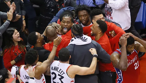 90 partout, quatre secondes à jouer, temps-mort Toronto. Kawhi Leonard hérite du cuir mais semble mal embarqué et poussé dans le corner sur sa main droite. Il parvient malgré tout à décrocher un « fadeaway » encore plus impossible que les autres devant Joel Embiid. Le ballon rebondit trois, peut-être quatre fois sur le cercle et les Dieux du basket font le reste : « buzzer beater » ! On fait difficilement mieux pour clore un Game 7…