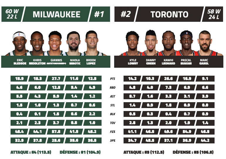 Giannis Antetokounmpo ou non, les Raptors devront également surveiller de près la ligne à 3-points, que les Bucks affectionnent tant. N’oublions pas que Milwaukee est l’équipe qui rentre le plus de tirs primés derrière les Rockets. Deuxième attaque et meilleure défense de ces playoffs (!), Milwaukee est également n°1 dans le secteur du rebond. Là où Toronto souffre particulièrement. Le contrôle du rebond et la gestion de la taille aura donc toute son importance dans cette série.