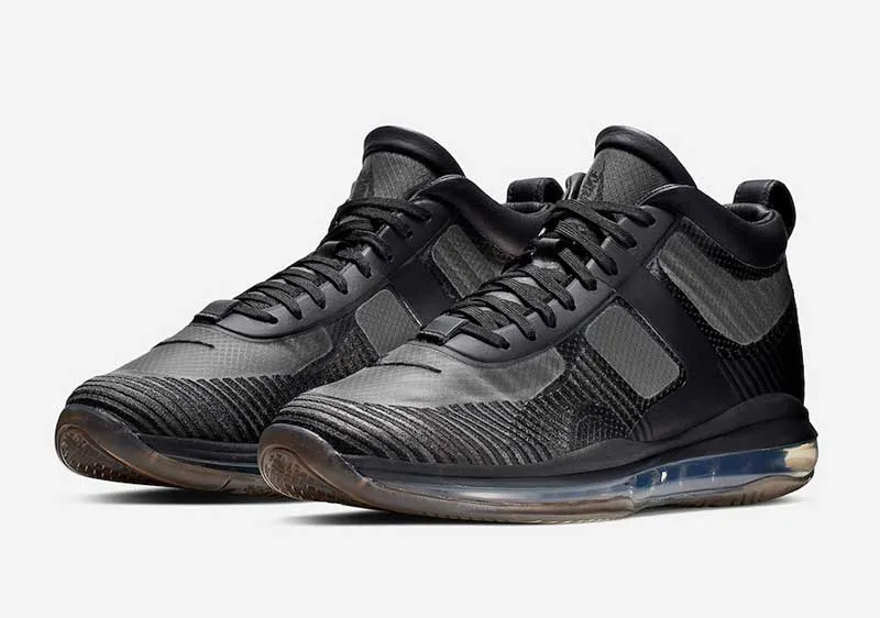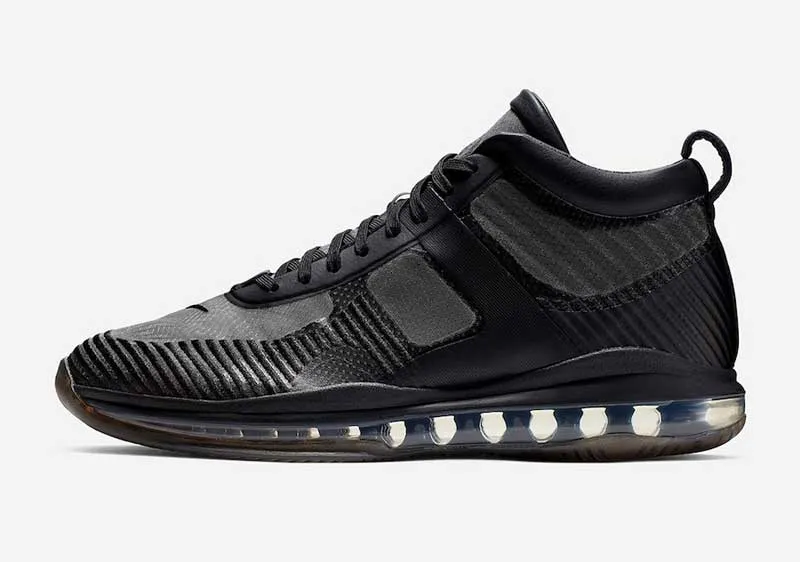 Cette fois, tout passe au noir. Le cuir, les empiècements synthétiques, la semelle translucide… Ambiance niveaux de gris.