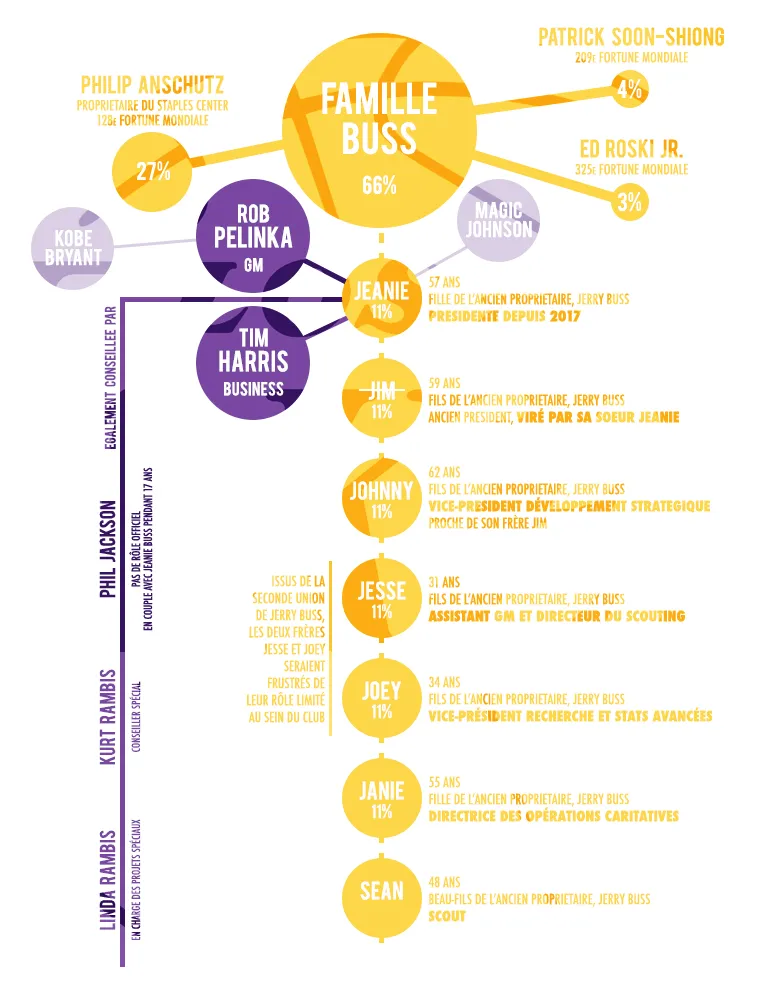 Homme à femmes, Jerry Buss a ainsi reconnu six enfants (Jeanie, Jim, Johnny, Jesse, Joey, Janie), qui travaillaient tous aux Lakers après sa mort. Chacun dispose de 11% des parts des Lakers, pour un total de 66% qui leur offre le contrôle de la franchise. On peut facilement comprendre comment cette répartition entraîne les problèmes de gouvernance et de hiérarchie au sein du club, chaque enfant de Jerry Buss se considérant à égalité avec les autres, et légitime pour donner son opinion.