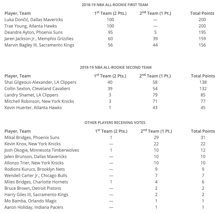On retrouve les cinq premiers choix de la Draft 2018 dans la First All-Rookie Team. Logiquement Luka Doncic et Trae Young font l’unanimité avec 200 points sur 200 possibles, alors que Deandre Ayton (195 points) manque de peu le Grand Chelem.
