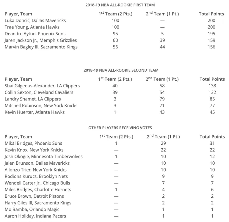 On retrouve les cinq premiers choix de la Draft 2018 dans la First All-Rookie Team. Logiquement Luka Doncic et Trae Young font l'unanimité avec 200 points sur 200 possibles, alors que Deandre Ayton (195 points) manque de peu le Grand Chelem.